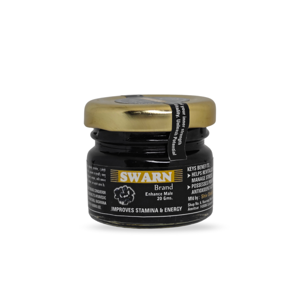 Swarn Enhance Male by Shiv Shakti Enterprises is a premium Ayurvedic formulation designed to improve male vitality, stamina, and overall energy levels. Packed in a 20g glass jar with a secure gold cap, this powerful tonic helps manage stress, revitalizes strength, and provides antioxidant support. Ideal for those seeking a natural and effective way to enhance performance and inner strength.